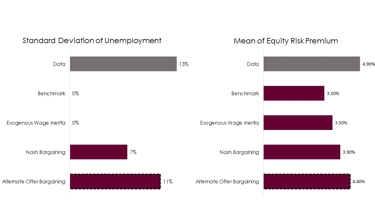 George and Alba (2020) compare the performances of different kinds of wage inertia to find that the AOB model brings the equity premium moment very close to its data counterpart. As the AOB model is able to account for key volatilities in the labour market, the long run risk increases under an AOB framework. In other words, periods of economic downturn are associated with relatively higher levels of unemployment, so there is a fear of being unemployed and being limited to the lower payment of unemployment benefits instead of wages. Such a fear of cashflow risk causes agents to demand higher equity premium.