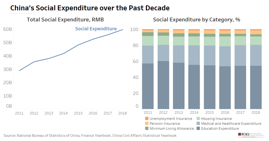 China’s Social Expenditure comprises of six different components: education expenditure, pension insurance, medical and healthcare expenditure, unemployment insurance, housing insurance, and minimum living allowance (China Development Research Foundation, 2013). Since 2017, China has emphasized the importance of increasing their investments in education, healthcare, and welfare benefits in order to mitigate inequities in social and economic development. This week’s Chart of the Week presents annual data from the National Bureau of Statistics of China, to depict the nation’s welfare expenditure and composition.