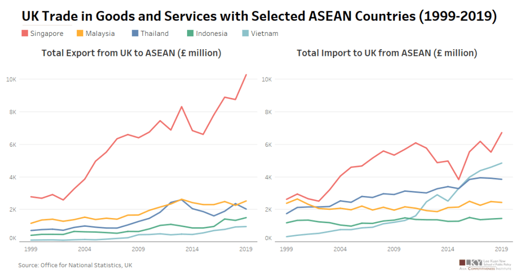 - Singapore has consistently been the U.K.’s biggest trading partner in ASEAN, with exports increasing nearly four-fold, and exports increasing by 2.5 times in the time period shown.