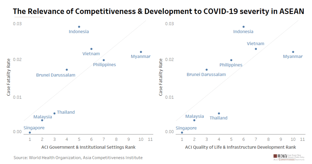 Of the eight ASEAN Member States where deaths have been reported, Singapore has the lowest case fatality rate despite having the highest number of cumulative COVID-19 cases per million population. Malaysia and Thailand also note comparatively lower case fatality rates despite having higher proportions of elderly in the population. Asia Competitiveness Institute (ACI)’s Annual ASEAN Competitiveness Index was found to be useful in understanding this phenomenon. This week’s chart demonstrates usage of the index and shares key research findings.