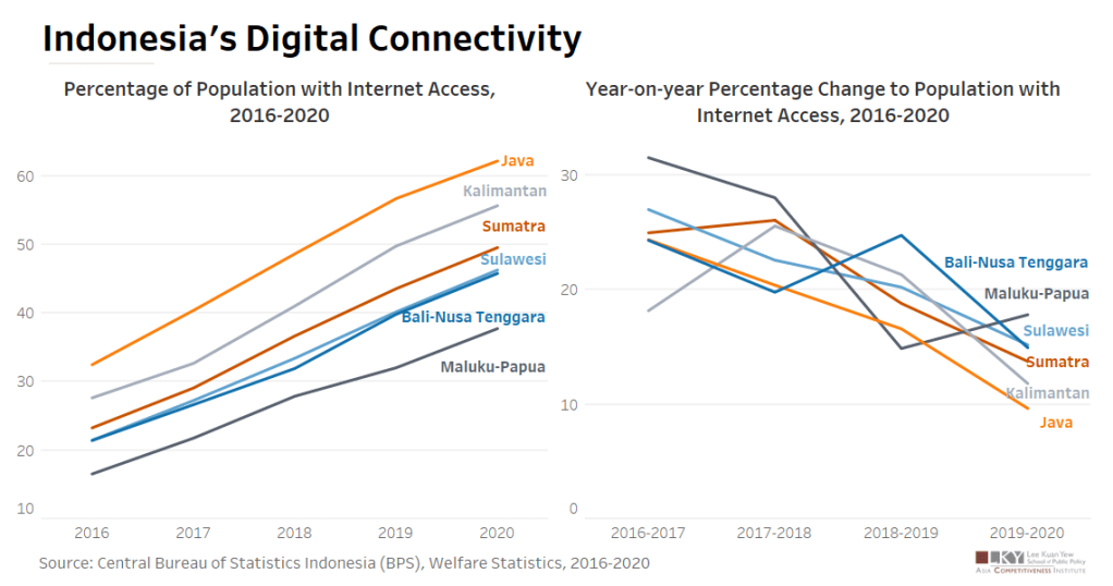 When Indonesia was forced to impose lockdowns and other degrees of social restrictions due to the pandemic, the digital sphere presented opportunities to maintain some degree of normalcy. 37%1 of consumers in Indonesia’s digital economy were only recently motivated to come online, due to the pandemic. 93% of consumers new to digital economy intend to continue patronizing online services and goods beyond the pandemic. This week’s chart assesses the accessibility of the internet in various regions of Indonesia.