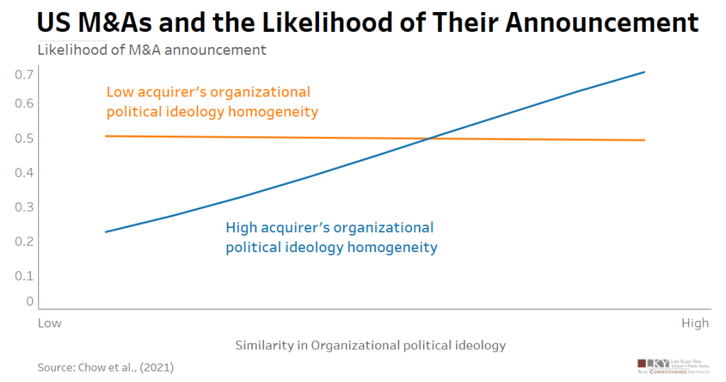 The steep blue line in the chart shows this positive relationship as more intense when political ideology is more homogenous amongst the workforce in the acquiring firm. Homogeneity in political ideology implies that the majority of the workforce follows a similar political ideology (liberalism or conservatism).
