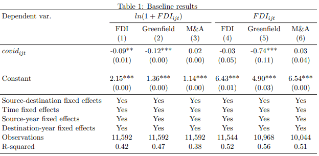 To summarize, Table 1 below shows the baseline results. A negative and statistically significant covidijt coefficient in column (1) indicates that a higher COVID-19 infection rate in the destination market relative to the source market deters FDI inflows to the destination market. In other words, FDI moves to destination markets less affected by the pandemic (or with better pandemic management). The Covidijt coefficient value indicates that a one percentage point increase in the new infection rate in the destination market relative to that in the source market corresponds to a drop in FDI inflows by 9 percent.