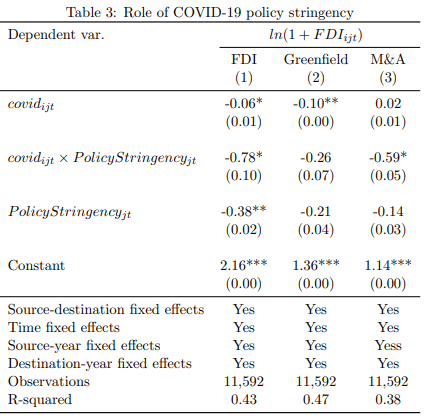 Third, the negative and significant interaction term coefficient from column (1) and (3) in Table 3 shows that COVID-19 policy stringency in the destination market strengthens the adverse impact of the pandemic on FDI inflows primarily through M&A mode of entry. From the negative and significant PolicyStringencyjt coeffcient estimate in column(1) of table 3, we also decipher that COVID-19 policy stringency directly discourages FDI.