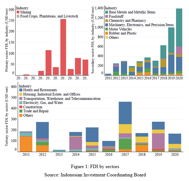 To deeply understand the source of Riau’s economic resilience in the face of the pandemic, it is imperative to get a stock of its economic performance. The biggest industry in the region, manufacturing contributes the most to the gross regional domestic product (GRDP). It is closely followed by construction, and mining and excavation. Although total GRDP had been increasing, its growth fell in the wake of the pandemic. As a result, the GRDP growth rate trailed far behind the targets specified in the RPJMD. Inflation has been well below the targets since 2016. Exports have not been able to meet the targets since 2018 despite several export-boosting programs. Both domestic and foreign investors invest the most in mining, manufacturing (transportation vehicles and electronic equipment), and chemistry and pharmacy industries. A wide range of other sectors also receive foreign direct investment (see figure 1).