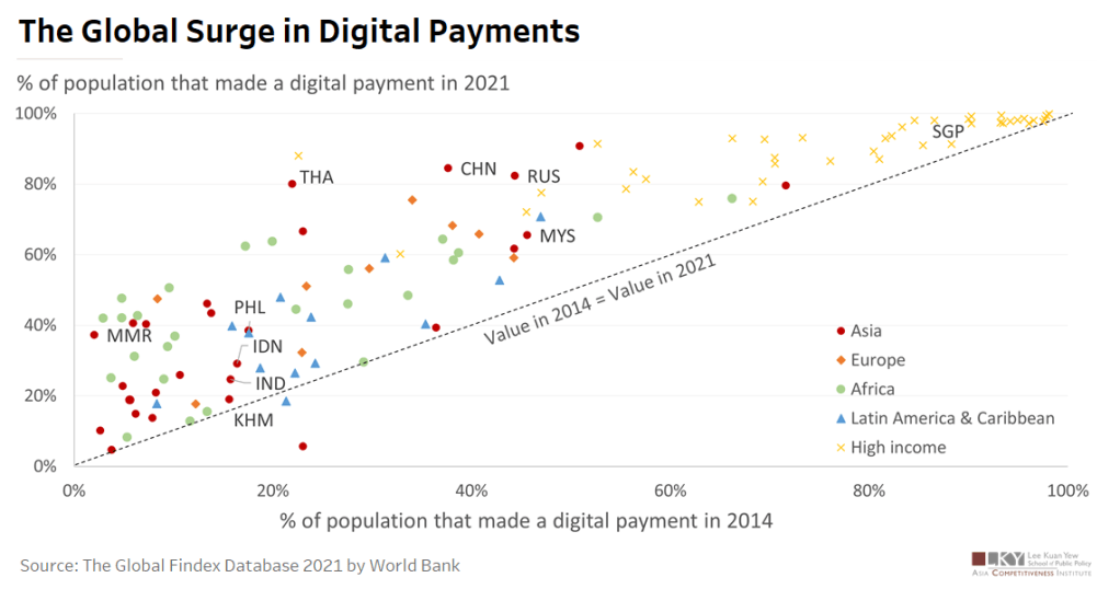 - Regionally, the Asian developing economies have shown the strongest growth in digital payments. With adoption rates ranging between 2-20% in 2014, some economies were able to more than double their adoption rates by 2021. Among the ASEAN emerging economies, the percentage of people using digital payments almost doubled in Thailand, Malaysia, the Philippines, and Myanmar.