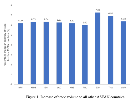 The study further explores the potential benefits of a broad and multilateral DEA within the ASEAN. ICT sectors in developing economies such as Cambodia, Laos, and Vietnam stand to gain most significantly due to increased collaboration. This could also considerably increase skilled labor demand in these countries. Moreover, if a single digital trade system is adopted, the region could experience a huge increase in the volume of trade among its countries (see Figure 1) which could improve trade integration in the region.