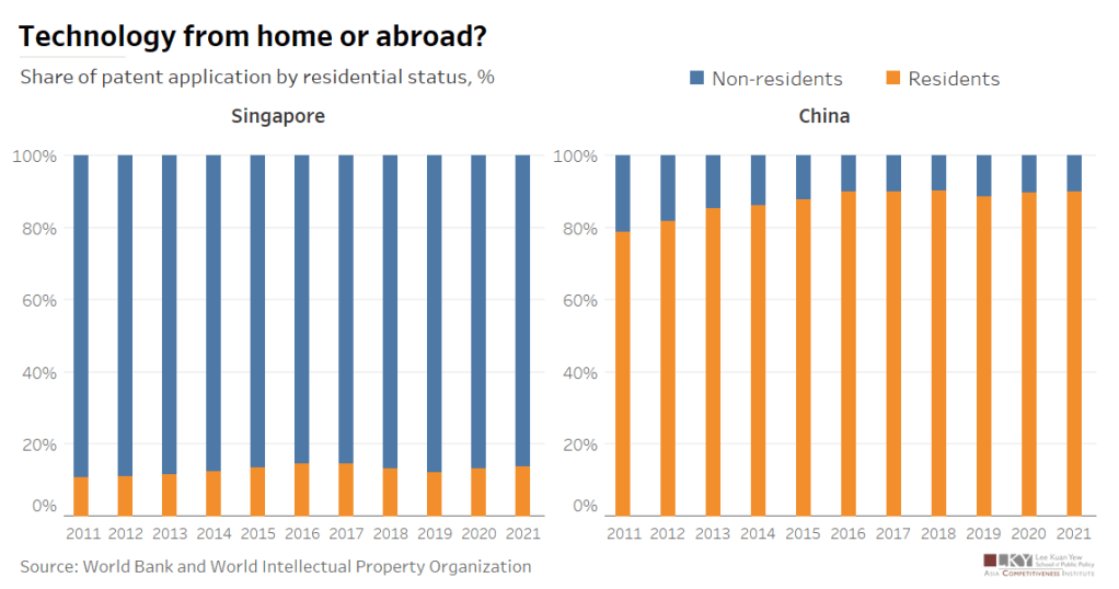 The residential status of patent applicants indicates the source of inventions in a country. Different technological development strategies of nations affect the structures of patent applicants’ profiles. For example, China’s favourable policies towards domestic innovation culminated in residents’ share in the country’s total patent filings at 90% in 2021. In contrast, 86% of Singapore patent applicants are from abroad. This shows that Singapore usually serves more as a laboratory for international technology transfer than as an origin of inventions. That said, Singapore also has growing domestic innovation capabilities. In the recent decade, the growth rate of domestic patents has been higher than that of foreign ones.