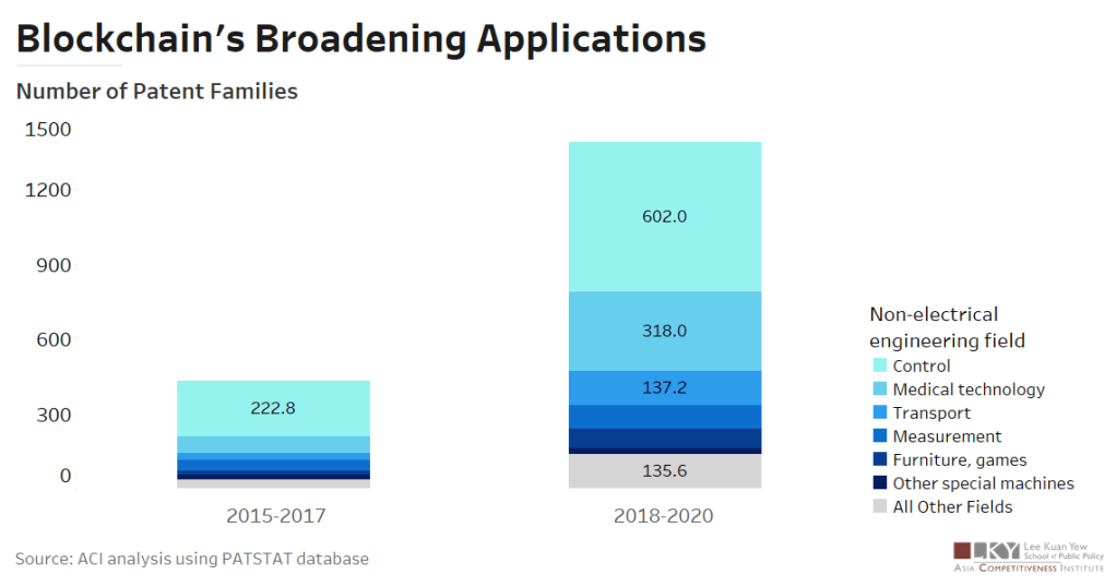 - Blockchain technology has broadened its applications outside of electrical engineering. The total number of patent families outside the electronic engineering fields has more than tripled in the past decade.