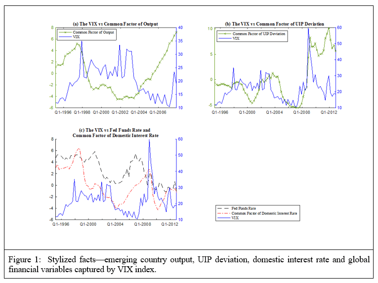 - Periods of high financial market risk captured by the VIX index coincide with periods of low output in the emerging countries. See plot (a) in Figure 1.