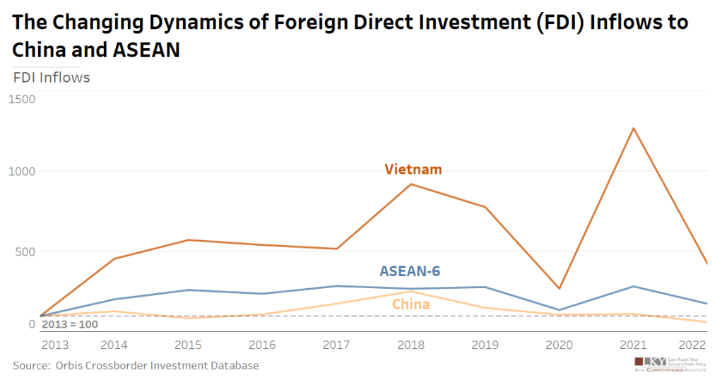 The FDI inflows into China and ASEAN countries have fluctuated over the years. Gobal events, including the US-China trade war and the Covid-19 pandemic, have brought challenges and opportunities for China and Southeast Asian nations. The graph shows the FDI inflows to China, Vietnam, and ASEAN-6 (Vietnam, Malaysia, the Philippines, Thailand, Indonesia, and Singapore) relative to their FDI inflows in 2013. The ASEAN-6, in total, have witnessed a higher growth in FDI inflows compared to China. In particular, Vietnam has stood out with large FDI inflows. As a country sharing similar comparative advantages to China, such as low-cost labour and geographic proximity, Vietnam received a remarkably higher amount of FDI during the US-China trade war from 2018 to 2019. Although Covid-19 pandemic adversely affected Vietnam’s inward FDI, Vietnam experienced a strong recovery of FDI inlows in 2021. China’s ongoing border control measures may have led to a reallocation of inward FDI from China to Vietnam. Vietnam’s FDI recovery seems short-lived as the FDI dropped in 2022 amid the Russia-Ukraine war.