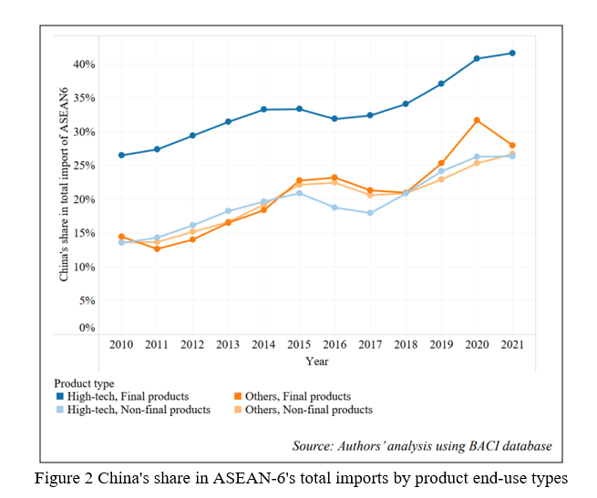 But these gains must be perceived with a grain of salt. Notwithstanding the evident decline of the US’s dependence on China amidst global supply chain restructuring, the West’s engagement with Chinese business persists in an indirect manner, through Southeast Asian countries. China’s ironclad influence on the ASEAN-6 economies is exemplified by close trade relations forged through the ASEAN-China Free Trade Agreement (ACFTA), the Belt and Road Initiative (BRI), and the Regional Comprehensive Economic Partnership (RCEP). As a result, China’s market share in ASEAN-6 imports of high-tech final product increased from 27% to 41% from 2011 to 2021 (Figure 2). Furthermore, much of the upswing in the bloc’s high-tech exports arise from the rebranding and transshipping of Chinese goods – raising questions on the value-add of ASEAN-6 in high-tech global trade.