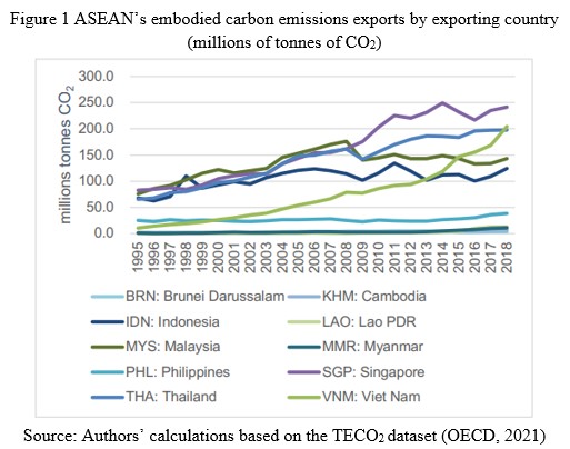 Upon decomposing the regional embodied carbon emissions in exports by member countries, Vietnam’s contribution has risen by the greatest magnitude – from 14.2 million tonnes to 204.3 million tonnes of CO2 from 1995 to 2018 due to its rapid growth as a producer and exporter. On the contrary, Brunei, Myanmar, Laos, and Cambodia have the lowest export-embodied emissions (Figure 1). Authors attribute the upswing in emissions in exports (and imports) to the large intra-Asian trade growth – during the same time period, export- and import-embodied emissions in trade flows within Asia have soared by more than three times, from 150 million tonnes to 530 and 450 million tonnes, respectively.