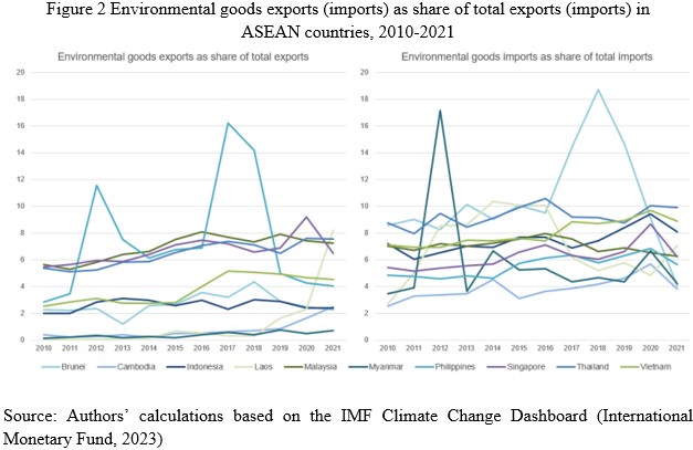 Simultaneously, ASEAN is also a net importer of environmental goods, with its imports outpacing exports by 30%. ASEAN’s environmental goods trade has also been commensurate with the world average between 2012-2021, its share oscillating between 6.3% and 7.2%. However, there has been no significant growth of environmental goods as share of total trade, indicating no heightened interest in trading these goods in recent years (Figure 2).