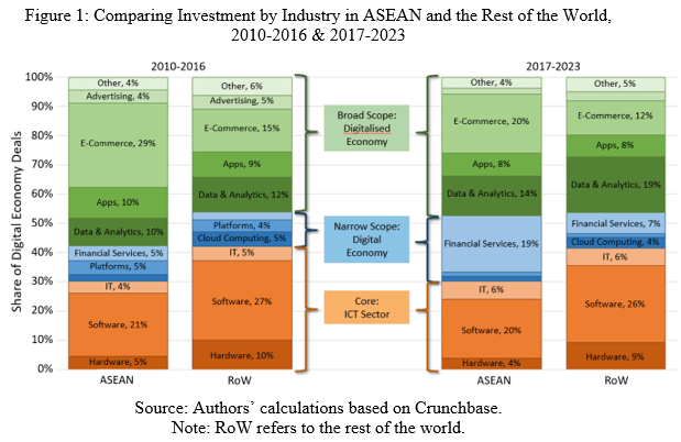 The study starts by asking about ASEAN and member states’ positions in the global digital economy investment. It was found that ASEAN had received the highest proportion of digital economy investments globally from 2020 to 2023. This is not driven by a single country of the ASEAN-6 (Singapore, the Philippines, Malaysia, Thailand, Vietnam, and Indonesia), but all of them demonstrated a higher than global average attractiveness in digital economy investments from 2020 to 2023, though Singapore is far ahead of the other five countries.