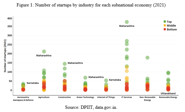 Diving deeper into the successes of the Middle- and Bottom-ranking subnationals, two frontrunners emerge – Haryana and Bihar. The former’s success stems from its abundant land supply and its proximity to Delhi; The seamless connectivity between Gurugram in Haryana and Delhi lets the former benefit from the latter in terms of legal procedures for setting up a new business. Bihar’s growth, on the other hand, is driven by progressive state policies promoting green energy, including a pioneering climate strategy, an encompassing EV policy, and widespread ethanol plant development, making it an aspiring hub for green industry startups.