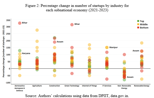 Plotting the startup trends in these key industries at the state level revealed that, while the Top subnational economies like Maharashtra and Karnataka have a large base in terms of startup numbers in 2021, they are surpassed by Middle- and Bottom-ranking states (as per ACI’s Competitiveness Index) like Bihar, Haryana and Assam in post-pandemic startup growth from 2021 to 2023 (Figures 1 and 2).