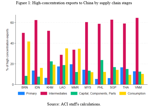 Regarding supply chain stages, ASEAN exports to China are majorly clustered in intermediate goods and raw materials. As illustrated in Figure 1, Indonesia, Malaysia, Singapore, and Vietnam account for more than 60% of such exports.